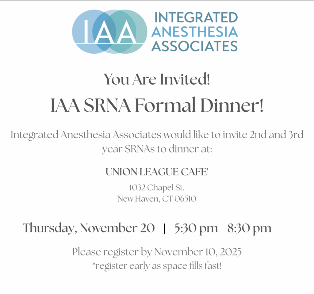 Join us for the IAA SRNA Formal Dinner — an elegant evening of celebration, connection, and great company. Please register by November 10, 2025 — space is limited and fills