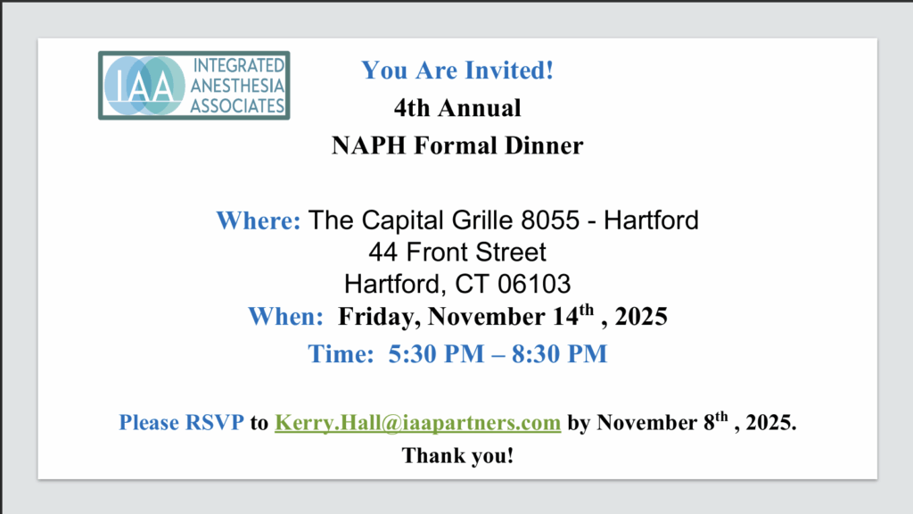 Join us for the 4th Annual NAPH Formal Dinner — an elegant evening of celebration, connection, and great company. Please RSVP by emailing by Kerry.Hall@iaapartners.com by November 8th, 2025.